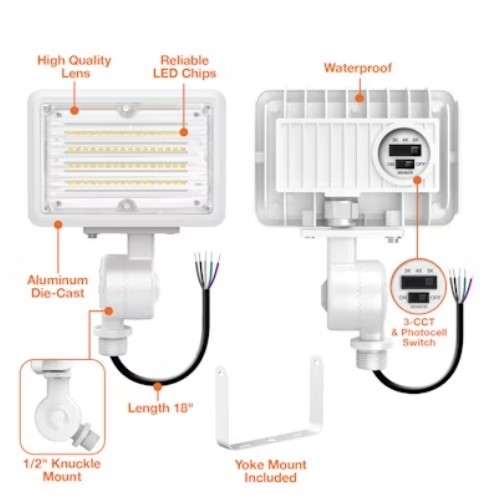 - Selectable photocell included on each fixture, 1/2" Knuckle Mount installed on each fixture, Yoke mount included in the box